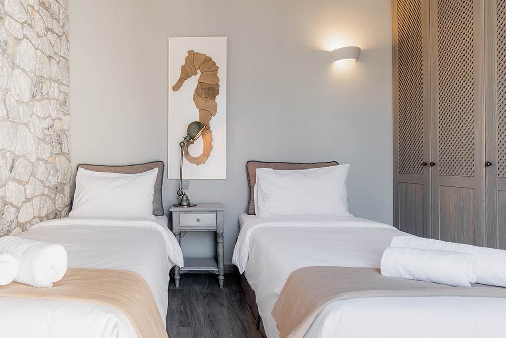 The stylish interior plays with a palette of grey and blue throughout the residence, while fun decorative nuances add to the home’s character. Its two levels feature an open-space living/dining area and kitchen, two bedrooms, and a bathroom. The main living area leads out to the private garden, where a seamless connection to the spectacular beach setting is on hand and provides plenty of room for lounging (free sunbeds provided upon request) and dining (there’s even a BBQ). Other conveniences include climate-controlled air- conditioning units throughout the home and WiFi access.